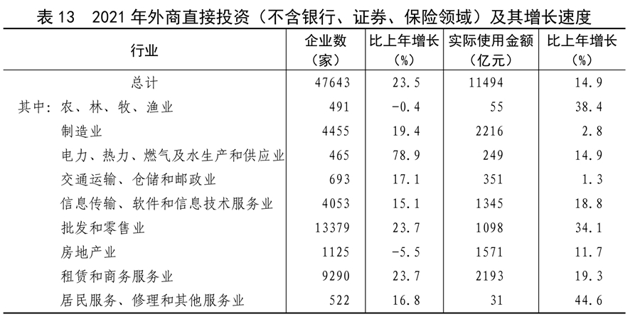 全年外商直接投資(不含銀行、證券、保險領域)新設立企業47643家,比上年增長23.5%。實際使用外商直接投資金額11494億元,增長14.9%,折1735億美元,增長20.2%。其中“一帶一路”沿線國家對華直接投資(含通過部分自由港對華投資)新設立企業5336家,增長24.3%;對華直接投資金額743億元,增長29.4%,折112億美元,增長36.0%。全年高技術產業實際使用外資3469億元,增長17.1%,折522億美元,增長22.1%。