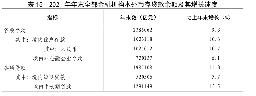 全年社會融資規模增量[45]31.4萬億元,按可比口徑計算,比上年少3.4萬億元。年末社會融資規模存量[46]314.1萬億元,按可比口徑計算,比上年末增長10.3%,其中對實體經濟發放的人民幣貸款余額191.5萬億元,增長11.6%。年末全部金融機構本外幣各項存款余額238.6萬億元,比年初增加20.2萬億元,其中人民幣各項存款余額232.3萬億元,增加19.7萬億元。全部金融機構本外幣各項貸款余額198.5萬億元,增加20.1萬億元,其中人民幣各項貸款余額192.7萬億元,增加19.9萬億元。人民幣普惠金融貸款[47]余額26.5萬億元,增加5.0萬億元。