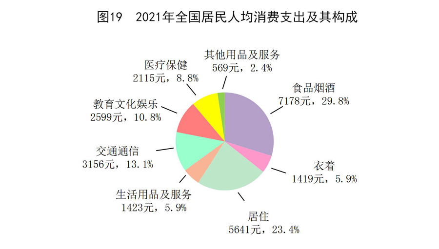 全年全國居民人均消費支出24100元,比上年增長13.6%,扣除價格因素,實際增長12.6%。其中,人均服務性消費支出[56]10645元,比上年增長17.8%,占居民人均消費支出的比重為44.2%。按常住地分,城鎮居民人均消費支出30307元,增長12.2%,扣除價格因素,實際增長11.1%;農村居民人均消費支出15916元,增長16.1%,扣除價格因素,實際增長15.3%。全國居民恩格爾系數為29.8%,其中城鎮為28.6%,農村為32.7%。