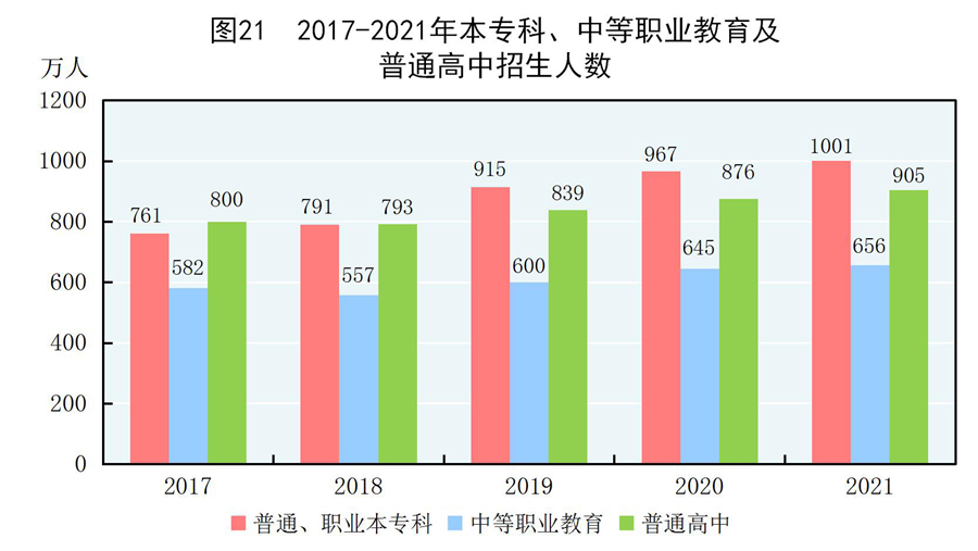 [65]普通、職業本專科包括普通本科、職業本科、高職(專科)。2021年高職(專科)招生人數統計口徑發生變化,包含五年制高職轉入專科招生人數。