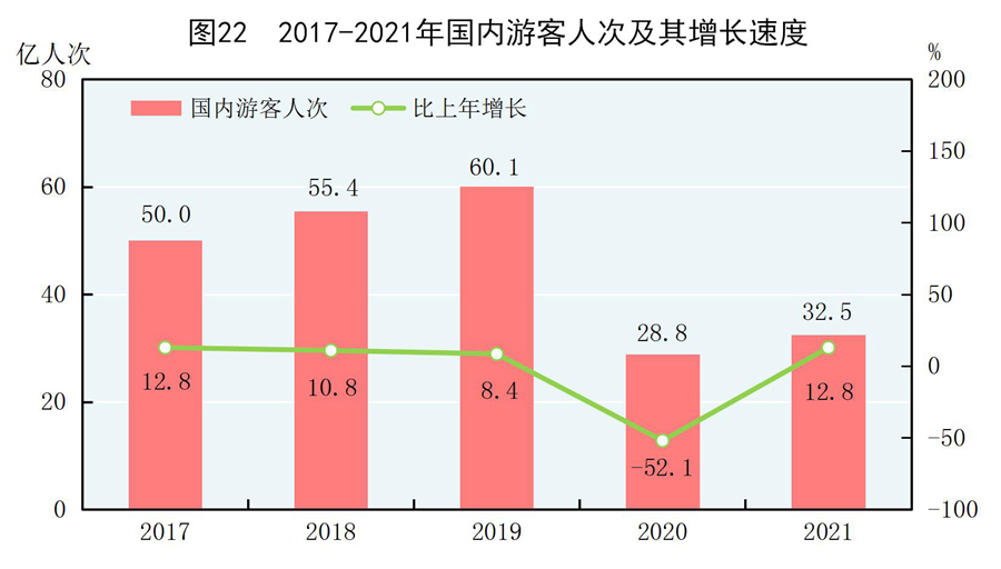 全年國內游客32.5億人次,比上年增長12.8%。其中,城鎮居民游客23.4億人次,增長13.4%;農村居民游客9.0億人次,增長11.1%。國內旅游收入29191億元,增長31.0%。其中,城鎮居民游客花費23644億元,增長31.6%;農村居民游客花費5547億元,增長28.4%。