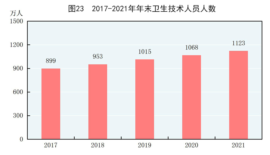 年末全國共有醫療衛生機構103.1萬個,其中醫院3.7萬個,在醫院中有公立醫院1.2萬個,民營醫院2.5萬個;基層醫療衛生機構97.7萬個,其中鄉鎮衛生院3.5萬個,社區衛生服務中心(站)3.6萬個,門診部(所)30.7萬個,村衛生室59.9萬個;專業公共衛生機構1.3萬個,其中疾病預防控制中心3380個,衛生監督所(中心)2790個。年末衛生技術人員1123萬人,其中執業醫師和執業助理醫師427萬人,注冊護士502萬人。醫療衛生機構床位957萬張,其中醫院748萬張,鄉鎮衛生院144萬張。全年總診療人次[70]85.3億人次,出院人數[71]2.4億人。截至年末,全國累計報告新型冠狀病毒肺炎確診病例102314例,累計治愈出院病例94792例,累計死亡4636人。全國累計報告接種新型冠狀病毒疫苗283533萬劑次。全國共有11937家醫療衛生機構提供新型冠狀病毒核酸檢測服務,總檢測能力達到4168萬份/天。
