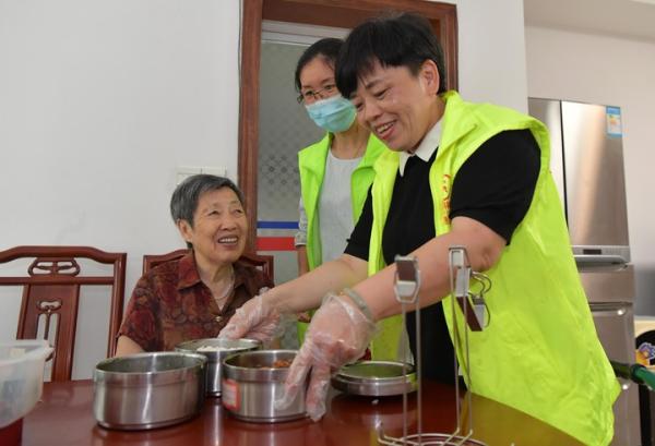 在江西省南昌市東湖區彭家橋街道文教路北社區,“幸福食堂”的義工在給社區內出行困難的老人提供送餐服務(2020年7月29日攝)。從2018年12月起,南昌市東湖區彭家橋街道在社區打造以黨建引領、社區主導、愛心企業贊助的“幸福食堂”,專門為社區獨居、孤寡及生活困難的老年人提供營養餐,以此進一步完善社區居家互助養老服務。新華社記者 彭昭之 攝