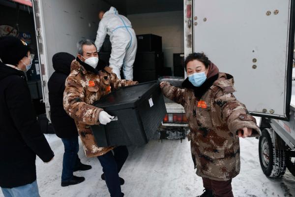 趙淑華(右一)指揮社區工作人員和志愿者搬運盒飯(2021年2月15日攝)。趙淑華是吉林省通化市東昌區團結街道文化社區副主任、網格長,臨近退休的她毫不猶豫投身抗疫一線。新華社記者 許暢 攝