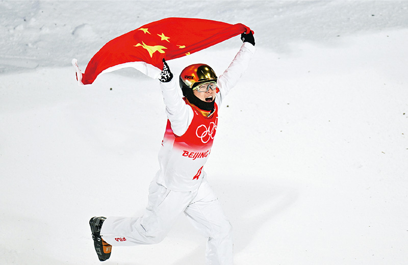 圖為2022年2月16日,中國選手齊廣璞慶祝奪冠。當日,北京2022年冬奧會自由式滑雪男子空中技巧決賽在張家口賽區舉行,中國選手齊廣璞獲得冠軍。 新華社記者 肖藝九/攝