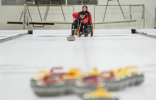 輪椅冰壺運(yùn)動(dòng)員王海濤(前)在國(guó)家殘疾人冰上運(yùn)動(dòng)比賽訓(xùn)練館投壺。新華社記者彭子洋攝。