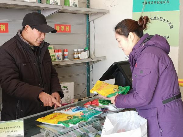 權太琦(右)在農資銷售店詢問價格變化。 新華社記者 陸華東 攝