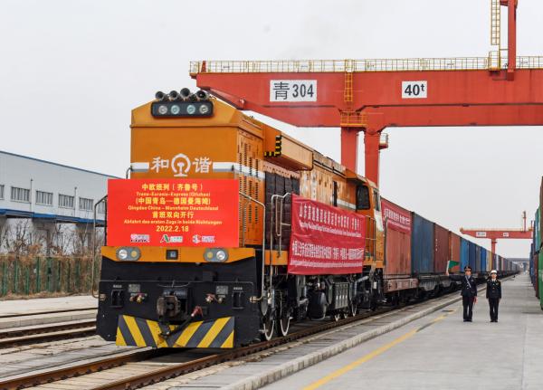 2月18日,中歐班列(齊魯號(hào))中國(guó)青島—德國(guó)曼海姆雙向?qū)﹂_首班列車從上合示范區(qū)青島多式聯(lián)運(yùn)中心出發(fā)。(新華社發(fā),王昭脈攝)
