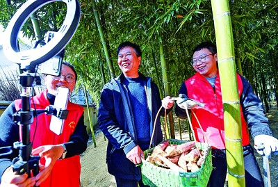 2021年12月23日,浙江省杭州市臨安區太湖源鎮黨員志愿者和種植戶在竹林直播采收雷筍,助力線上銷售。新華社發