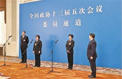 3月4日,全國(guó)政協(xié)十三屆五次會(huì)議首場(chǎng)“委員通道”采訪活動(dòng)在北京人民大會(huì)堂新聞發(fā)布廳舉行。圖為委員們?cè)诨卮鹩浾咛釂枴H嗣袢請(qǐng)?bào)記者 郭雪巖攝