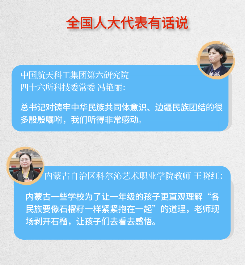 “休戚與共、榮辱與共、生死與共、命運與共”——習近平總書記深刻闡釋中華民族共同體理念,讓現場代表們印象深刻,倍受激勵。與會代表表示,總書記的殷殷囑托要“牢記在心,落實于行”。