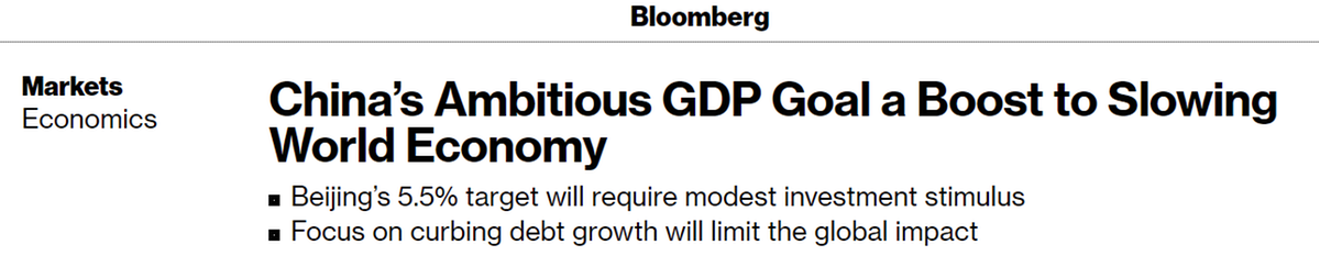 據美國彭博社3月6日報道,中國政府工作報告將今年GDP增長目標確立為“5.5%左右”。這一目標明顯高于國際貨幣基金組織(IMF)預測的4.8%和經濟學家此前預測的5.2%。