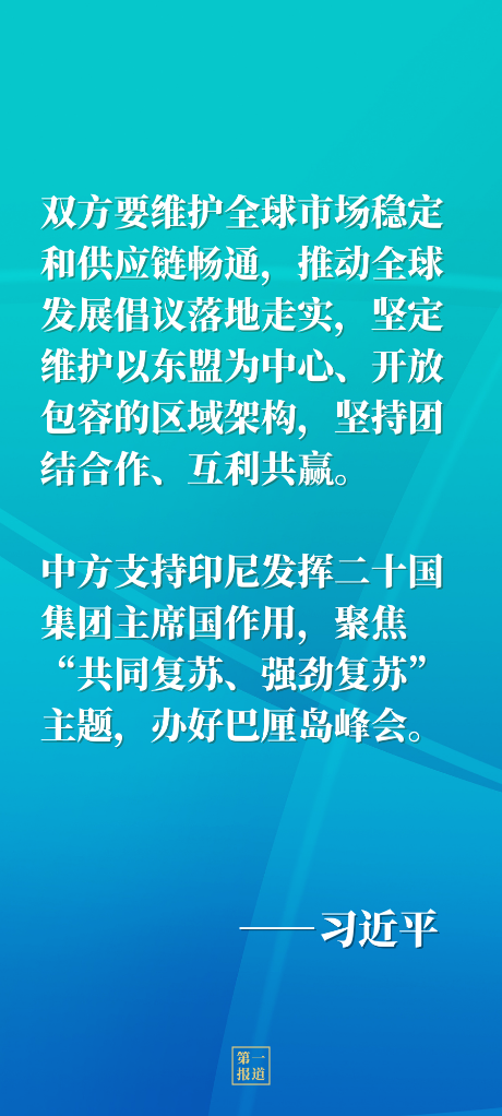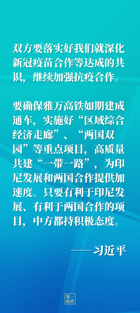 習(xí)近平強(qiáng)調(diào),雙方要落實(shí)好我們就深化新冠疫苗合作等達(dá)成的共識(shí),繼續(xù)加強(qiáng)抗疫合作。要確保雅萬(wàn)高鐵如期建成通車(chē),實(shí)施好“區(qū)域綜合經(jīng)濟(jì)走廊”、“兩國(guó)雙園”等重點(diǎn)項(xiàng)目,高質(zhì)量共建“一帶一路”,為印尼發(fā)展和兩國(guó)合作提供加速度。只要有利于印尼發(fā)展、有利于兩國(guó)合作的項(xiàng)目,中方都持積極態(tài)度。雙方要維護(hù)全球市場(chǎng)穩(wěn)定和供應(yīng)鏈暢通,推動(dòng)全球發(fā)展倡議落地走實(shí),堅(jiān)定維護(hù)以東盟為中心、開(kāi)放包容的區(qū)域架構(gòu),堅(jiān)持團(tuán)結(jié)合作、互利共贏。中方支持印尼發(fā)揮二十國(guó)集團(tuán)主席國(guó)作用,聚焦“共同復(fù)蘇、強(qiáng)勁復(fù)蘇”主題,辦好巴厘島峰會(huì)。