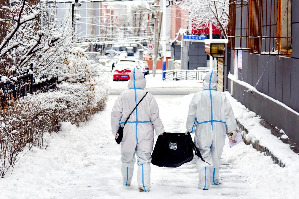3月16日,長春市朝陽區永昌街道社區工作人員挨門挨戶發送“新冠病毒抗原自檢測試劑盒”。新華社記者 周長慶 攝