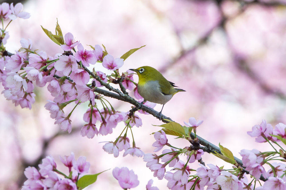 ↑ 一只繡眼鳥在江蘇無錫太湖黿頭渚景區的櫻花枝頭上小憩。