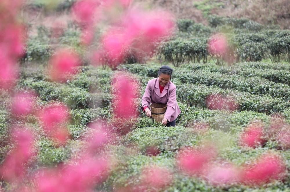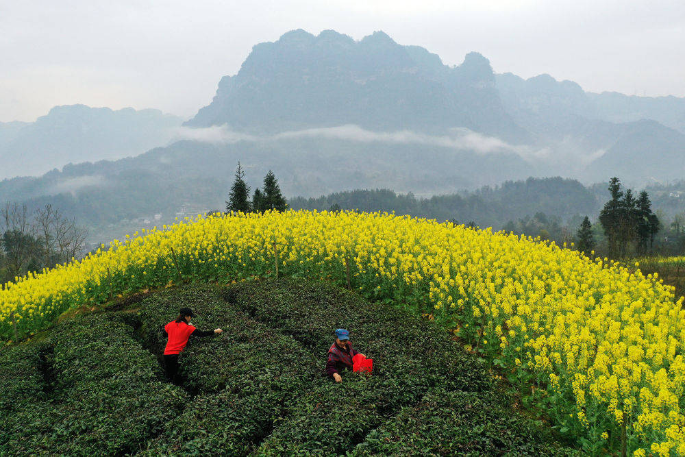 ↑ 游客在宣恩縣彭家寨古吊腳樓前賞花游玩。