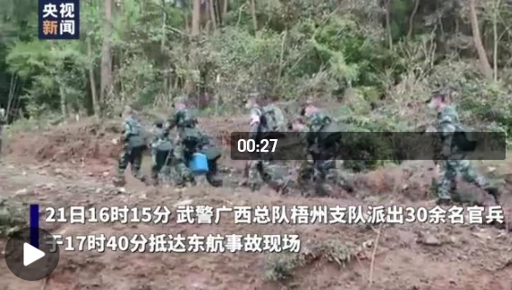 3月21日下午,東方航空公司一架客機在廣西梧州市上空失聯并墜毀。事故發生后,武警廣西總隊第一時間分析研判形勢,安排部署救援行動,協調保障,并成立前指深入救援一線,加強現場指揮。21日16時15分,武警廣西總隊梧州支隊與地方應急管理部門對接,派出30余名官兵攜鐵鏟、救生繩、救援包等物資先期出發,于17時40分抵達救援現場。截至21日21時許,共有80余名武警官兵先后到達救援現場,火速投入到封控、搜救、清理現場等工作中。(總臺記者 廖汨 劉暢)