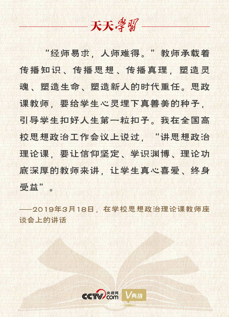 教師是立教之本、興教之源,辦好思想政治理論課關鍵在教師。一位好老師不但是知識的傳播者,更是崇高理想和高尚道德的培育者、學生成才的引路人。要用中國夢打牢廣大青少年的共同思想基礎,教育和幫助青少年樹立正確的世界觀、人生觀、價值觀,永遠熱愛我們偉大的祖國,永遠熱愛偉大的中國共產黨,永遠熱愛我們偉大的人民,永遠熱愛我們偉大的中華民族,堅定跟著黨走中國道路。