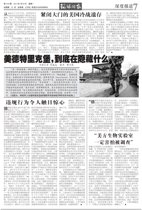 環球時報:讓我們再談談德特里克堡。您曾表示:“德特里克堡過去曾是、現在仍是美國生物戰的研究中心。早在上世紀50年代,他們就與CIA密切合作,在德特里克堡成立‘特種作戰部’,專門從事生物武器制造。”您還注意到,美軍在朝鮮戰爭中實施細菌戰后,德特里克堡多名生物武器研究人員接連暴斃,而美國軍方從未公布對此事進行的調查情況。美國民間對此為什么保持沉默?
