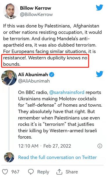 一位記者指出,英國廣播公司(bbc)對烏克蘭人制作燃燒瓶對付俄羅斯軍人的行為大加贊揚,但當巴勒斯坦人因為向裝備全副西式武裝的士兵扔石子被殺時,西方卻稱巴勒斯坦人為“恐怖分子”。一位肯尼亞政治家說得更直接:“西方雙標起來沒有底線!