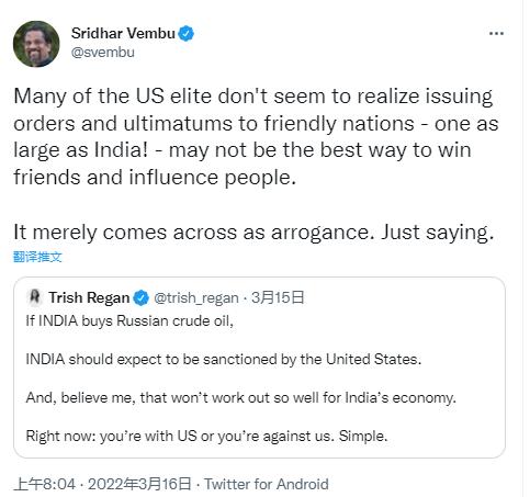 美國?怂股虡I頻道女主播翠西·里根15日也在社交媒體上發文稱,“如果印度購買俄羅斯原油,應該受到美國制裁。這對印度經濟來說不是好事,F在(印度面臨的選擇)是支持美國還是反對美國,這很簡單。”印度富商、軟件公司zoho創始人斯里達爾·芬布隨后轉發該帖文寫道,“許多美國精英似乎沒有意識到,對一個像印度這樣大的友好國家發號施令和下達最后通牒,可能不是贏得朋友和影響他人的最佳方式。只能給人傲慢的印象!