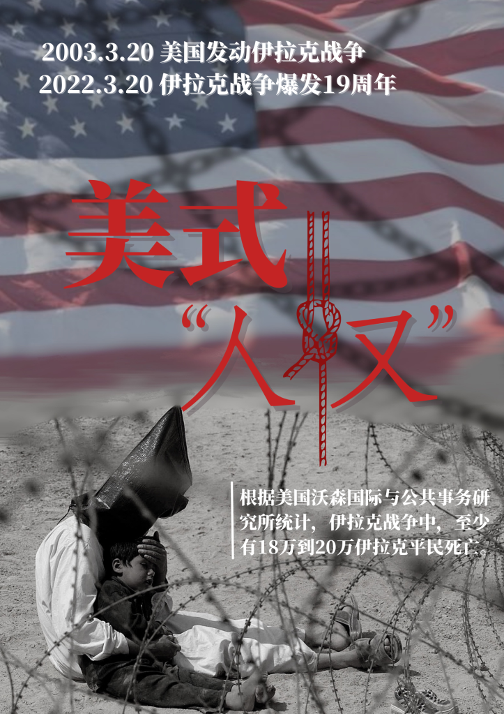 新華社巴格達3月22日電(記者董亞雷 張淼)2003年3月20日,美國及其西方盟友以所謂伊拉克有大規模殺傷性武器為由,不顧國際社會強烈反對,繞過聯合國安理會,悍然入侵伊拉克。時至今日,美國也未拿出大規模殺傷性武器的證據。而這場戰爭導致伊拉克生靈涂炭,持續動蕩,極端組織趁亂坐大,恐怖襲擊和教派沖突頻發。