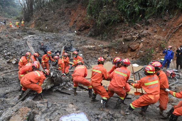 3月24日,搜救人員在事故核心現(xiàn)場繼續(xù)進(jìn)行搜索工作。新華社記者 陸波岸 攝