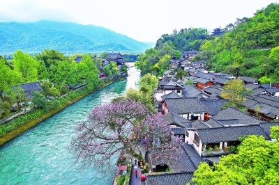 3月22日,四川省都江堰市岷江畔,翠綠的江水與泡桐花、古城交融在一起,構成一幅美麗的風景畫。艾加憲攝/光明圖片