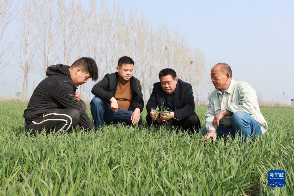這是山東汶上縣苑莊鎮道立種植農民專業合作社理事長張道立(右二)與同事查看苗情(3月24日攝)。新華社發