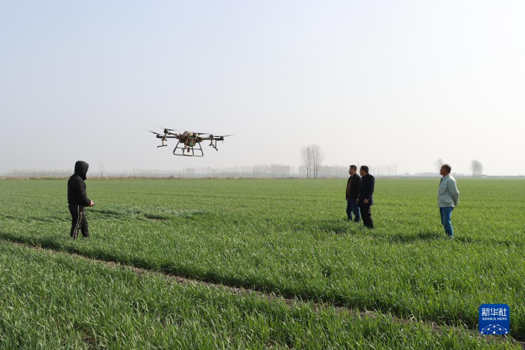 這是山東汶上縣苑莊鎮道立種植農民專業合作社社員用農用無人機噴灑農藥(3月24日攝)。新華社發(劉娜攝)