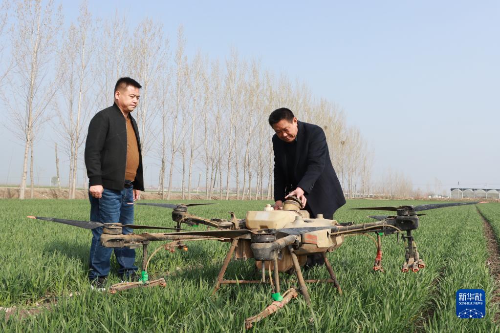 這是山東汶上縣苑莊鎮道立種植農民專業合作社理事長張道立(右)查看農用無人機(3月24日攝)。新華社發(劉娜攝)