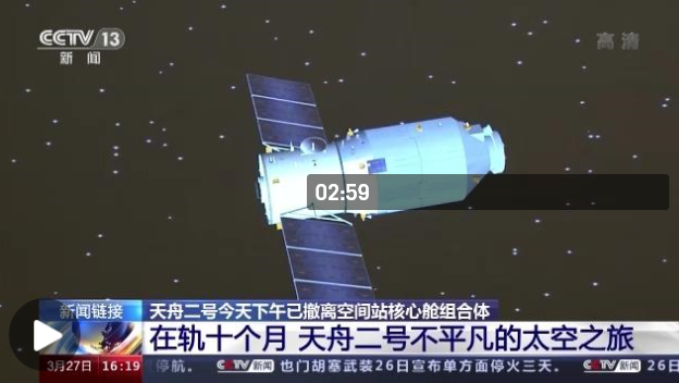 北京航天飛行控制中心貨運飛船任務總師 鄒雪梅:實驗完成了以后,天舟二號按計劃要實施離軌,我們目前是兩次的這樣一個離軌的控制,最終在受控的狀態(tài)下再入到南太平洋,在再入過程當中會徹底解體燒毀,不會對地面、海面的這些設施、船只帶來影響。