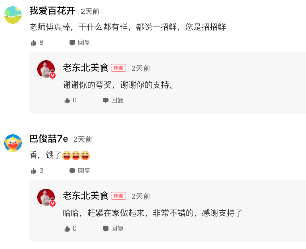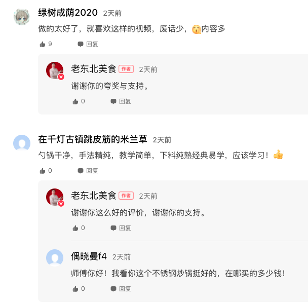 說(shuō)到做短視頻以來(lái)最大的收獲,老東北感嘆道:“由于原來(lái)教學(xué)方式枯燥很難理解,一些比較老的菜品和烹飪方法,幾乎很難被大家熟知,面臨失傳,通過(guò)短視頻的方式可以很好的保留和宣傳,每天在好看視頻上瀏覽粉絲們的留言,回復(fù)大家的問(wèn)題,感覺(jué)特有成就感!”