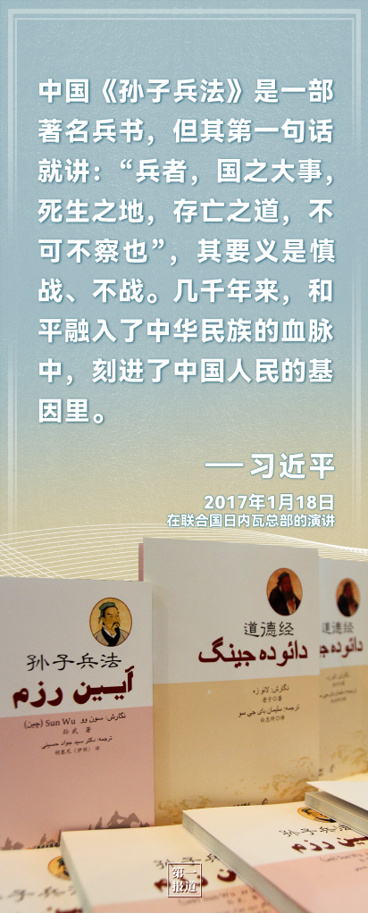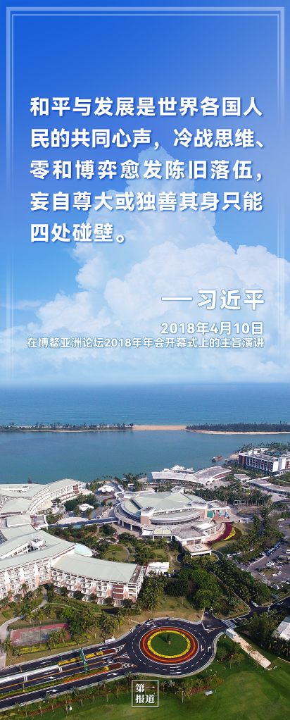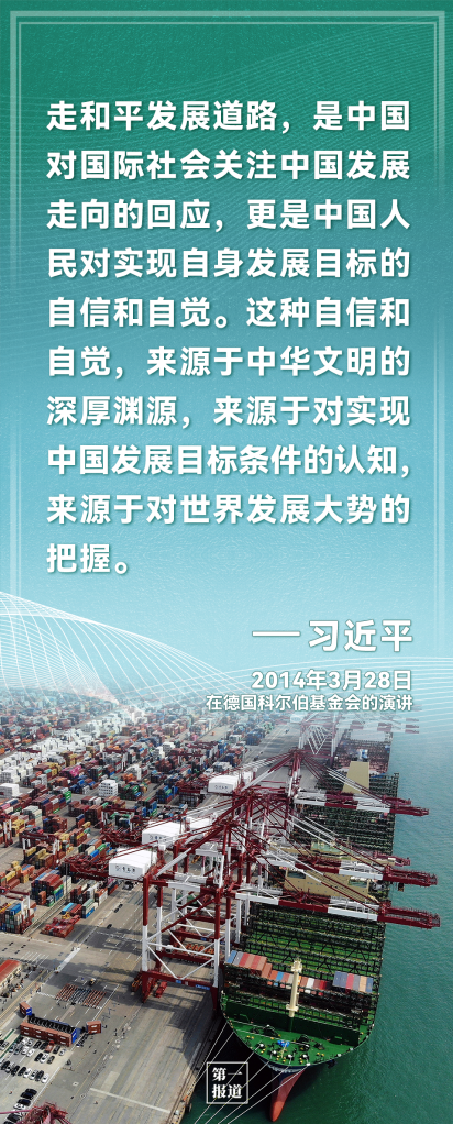中國走和平發展道路,不是權宜之計,更不是外交辭令,而是從歷史、現實、未來的客觀判斷中得出的結論,是思想自信和實踐自覺的有機統一。進入新時代以來,習近平在多個場合,這樣闡述——