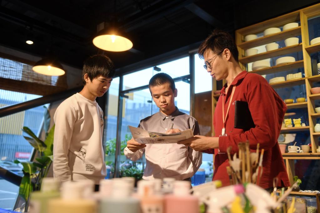 在福州市臺灣青年創(chuàng)業(yè)就業(yè)基地,臺灣青年(右一)討論產(chǎn)品策劃方案。新華社記者 林善傳 攝