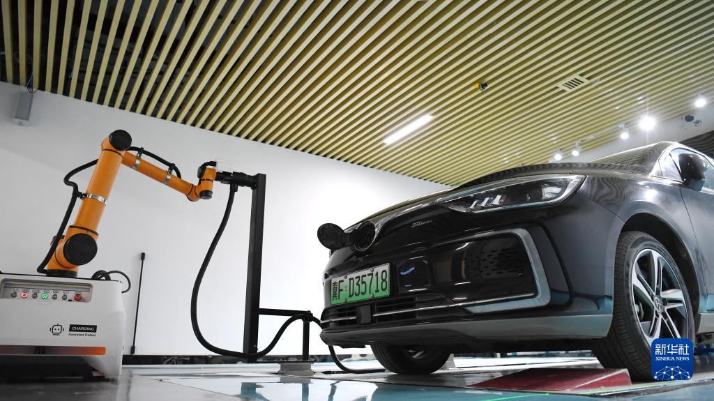 在雄安新區劇村變電站智慧充電區,插拔槍機器人為一輛電動汽車充電(3月18日攝)。新華社記者 朱旭東 攝