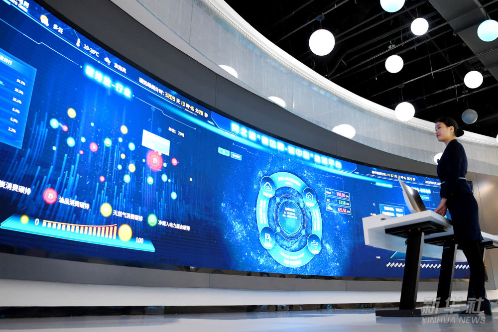 位于雄安新區首座新建220千伏變電站——劇村站內的“碳達峰、碳中和”監測平臺,通過電力大數據折算碳排放量,對雄安新區碳排放、碳減排、碳匯進行實時監測分析(2022年3月18日攝)。