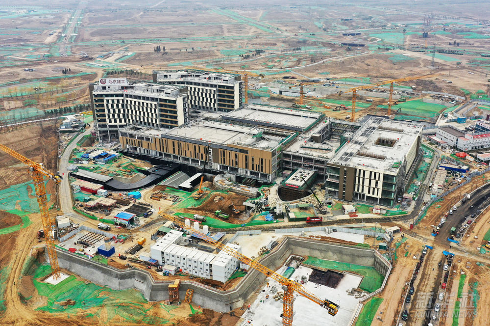 這是雄安新區首家三甲醫院——首都醫科大學宣武醫院雄安院區項目建設施工現場(無人機照片,2022年3月29日攝)。該工程由北京市援建,總建筑面積12.2萬平方米,包括門診樓、醫技樓、住院樓、科研樓等,主體結構于2021年8月封頂,建成后將成為擁有600張床位的獨立運行三級甲等醫院。
