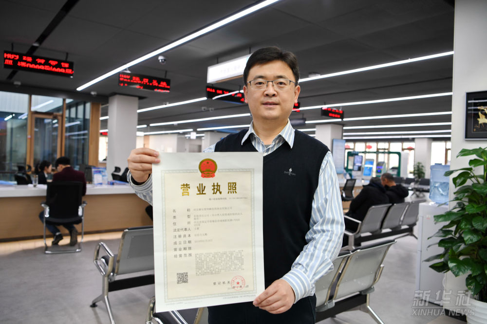 一家入駐雄安新區的企業工作人員在市民服務中心內展示辦理的營業執照(2019年1月17日攝)。