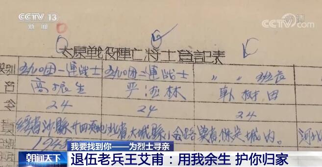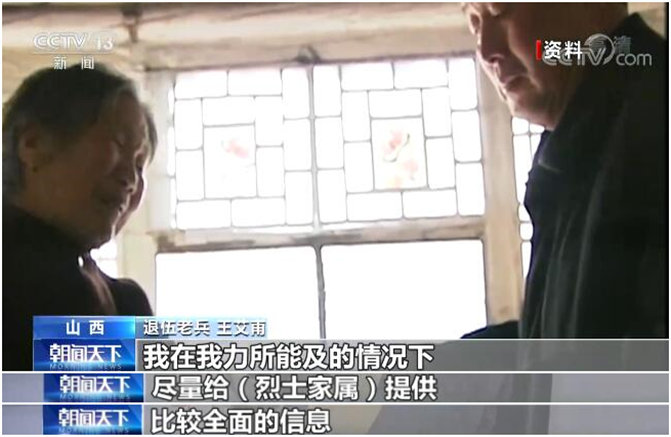 清明節是思念親人、祭奠英烈的日子。目前,全國有196萬余名登記在冊的烈士,由于種種原因,一些烈士信息不夠完整準確,一些烈屬只知親人犧牲,卻不了解詳細信息,不知其安葬的地址,更無從現場祭奠,為了讓這些英雄能夠魂歸故里,很多人都在為他們尋找回家之路。今天(4月3日)的“我要找到你——為烈士尋親”系列節目,我們來講述退伍老兵王艾甫堅持20多年為陣亡烈士尋找親人的故事。