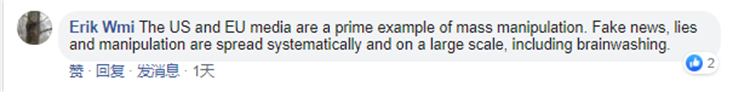 網(wǎng)友Erik Wmi在人民網(wǎng)英文社交媒體賬號留言稱:“美國和歐盟的媒體是大規(guī)模操縱的典范。假新聞、謊言被系統(tǒng)地、大規(guī)模地傳播,給人們洗腦。”