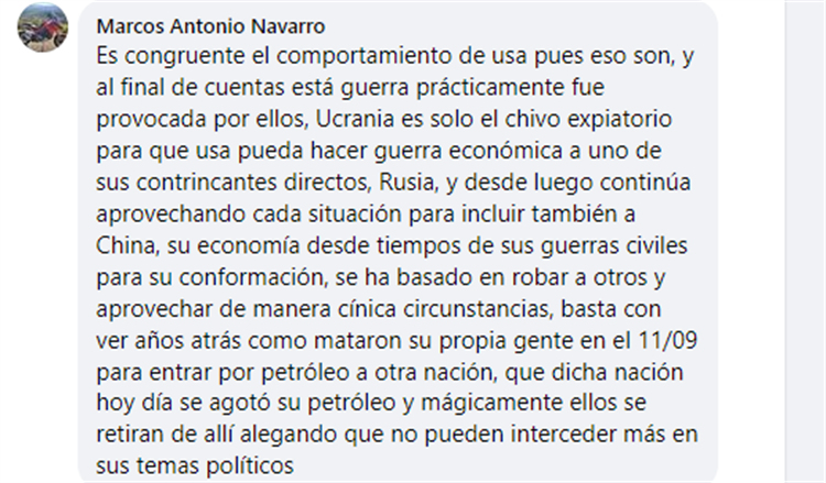 有西語網(wǎng)友表示,這場戰(zhàn)爭實際上是因美國而起,烏克蘭只是替罪羊,美國卻可以借此向俄羅斯挑起經(jīng)濟(jì)戰(zhàn):“美國當(dāng)然還會繼續(xù)利用各種事件,屆時將把中國也卷進(jìn)來。美國的經(jīng)濟(jì)從很久之前內(nèi)戰(zhàn)時期就是建立在竊取和利用別人的成果之上的,看看9.11事件,美國為了獲取另一個國家的石油,殺了自己的人民,而另一個國家今時今日已經(jīng)石油枯竭。荒謬的是此時美國說要撤軍,借口說他們不再介入別國的政治了。”