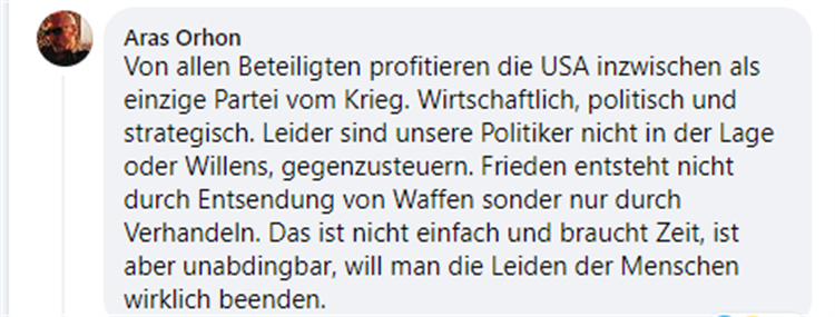 “他們希望戰(zhàn)爭繼續(xù)下去以出售更多的武器。”德國網(wǎng)友也表示,美國是戰(zhàn)爭中唯一一個從各方獲益的國家,包括經(jīng)濟(jì)、政治和戰(zhàn)略層面。“可惜我們的政治家們既無能力也無意愿加以抵制。”海外網(wǎng)友道破美國在這場危機中的利益所在。