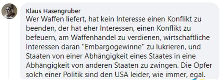 海外網(wǎng)友直言,軍火商并不想終止戰(zhàn)爭,只想火上澆油,從而在軍火生意中大賺一筆,從“制裁紅利”中攫取利益并且強迫主權(quán)國家依附于別的國家。“不幸的是,美國對這種策略的犧牲者毫不在乎。”