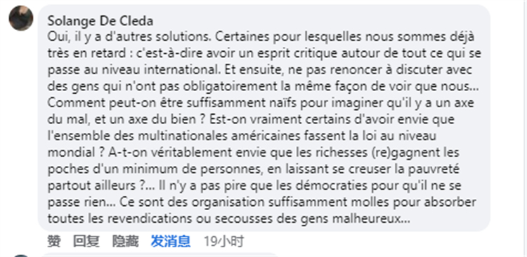 還有網(wǎng)友呼吁大家對國際層面發(fā)生的一切事情都要有批判性思維:“大家真的希望讓美國的多邊組織制定全球范圍內(nèi)的法律嗎?大家真的希望讓財富(重新)進(jìn)入少數(shù)人的口袋,貧困在其他地方加劇嗎?沒有什么比未曾遭遇這一切的民主國家更糟糕了……這些組織像塊‘海綿’吞沒了所有不幸人民的聲音和所遭遇的沖擊……”