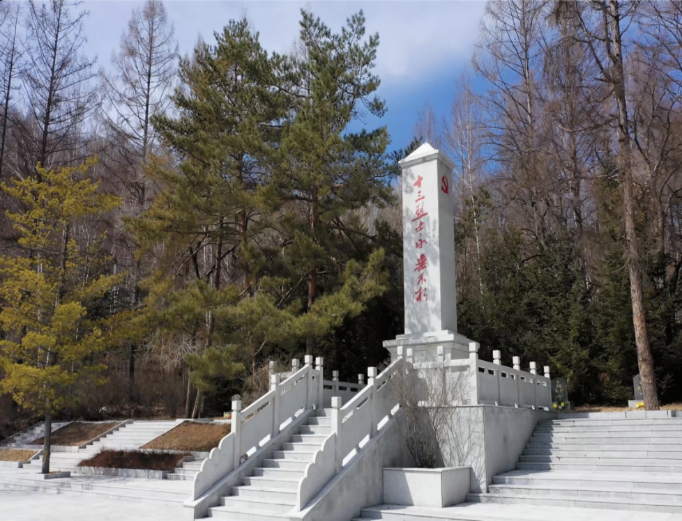 “1938年農歷8月17日,當地抗日游擊隊在參加一場戰斗后返回密林深處的大荒溝休整。因叛徒告密,日軍夜晚偷襲,13位隊員在戰斗中犧牲。英雄的遺體被就地掩埋、合葬在此。1958年,當地黨委和政府將烈士遺骸整理出來重新安葬,分別立碑。”