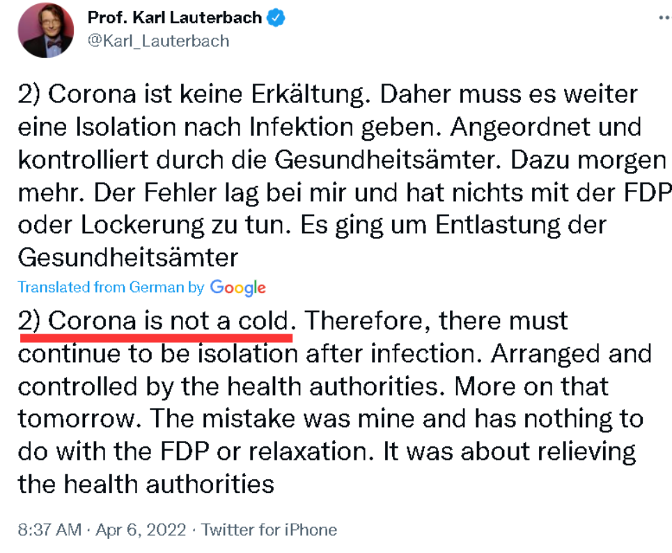 勞特巴赫甚至還在自己的社交賬號上公開道歉,稱自己“犯了一個錯誤”。他說,雖然取消陽性病例的強制隔離措施可以減輕德國各地衛生部門的負擔,但此舉卻發出了一個“錯誤和有害”的信號,因為“新冠不是感冒”。