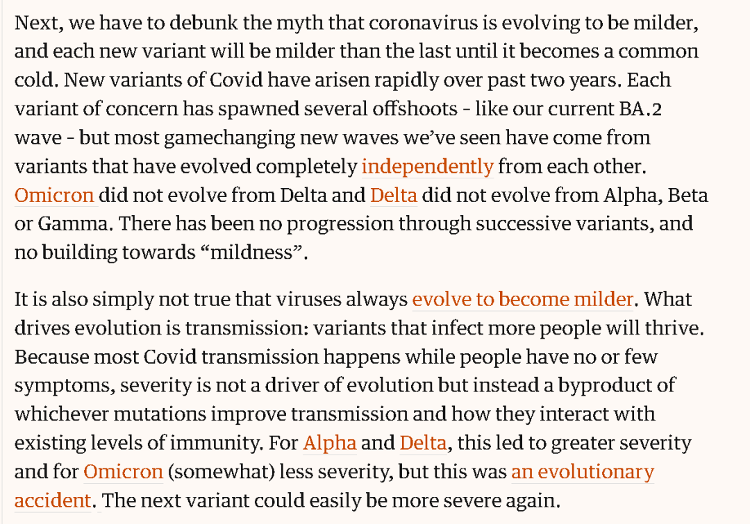 其次,人們認為新冠病毒的變異路徑一定是“越變毒性越輕”的,誤以為新冠病毒的毒株最終會變異成接近普通感冒的水平。可問題是,奧密克戎毒株并不是從德爾塔毒株變異過來的,而是獨立變異的,就像德爾塔毒株也不是從阿爾法毒株變異過來的一樣,這些毒株之間并不存在變異上的繼承關系。同時,病毒毒株在人群中的變異并不都是越變毒性越弱的,因為決定毒株變異因素的并不是毒性,而是傳染性,毒性只是這種變異過程中的一個副產物。換言之,奧密克戎的毒性偏弱以及德爾塔的毒性偏強,其實都是病毒在變異過程中隨機出現的,所以不排除下一種新出現的毒株反而毒性會比奧密克戎更強。
