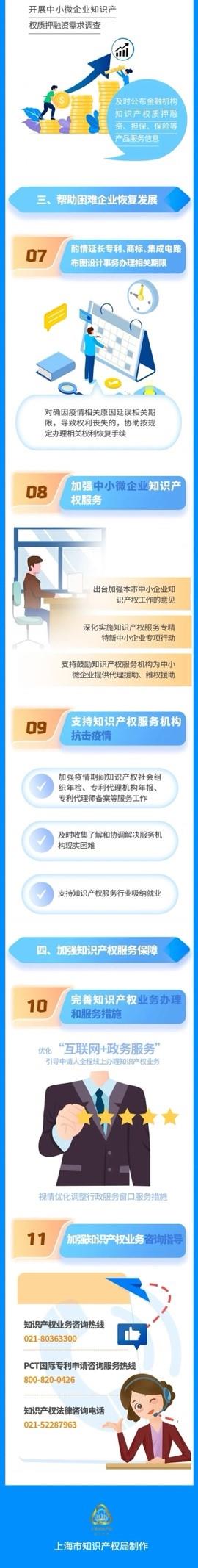 為加強(qiáng)助企紓困:酌情延長辦理期限,對(duì)申請(qǐng)辦理專利、商標(biāo)、集成電路布圖設(shè)計(jì)等事務(wù),確因疫情相關(guān)原因延誤相關(guān)期限,導(dǎo)致權(quán)利喪失的,協(xié)助按規(guī)定辦理相關(guān)權(quán)利恢復(fù)手續(xù)。加強(qiáng)中小微企業(yè)服務(wù),出臺(tái)加強(qiáng)本市中小企業(yè)知識(shí)產(chǎn)權(quán)工作的意見,深化實(shí)施知識(shí)產(chǎn)權(quán)服務(wù)專精特新中小企業(yè)專項(xiàng)行動(dòng),支持鼓勵(lì)知識(shí)產(chǎn)權(quán)服務(wù)機(jī)構(gòu)為中小微企業(yè)提供代理援助、維權(quán)援助。支持服務(wù)機(jī)構(gòu)抗擊疫情,加強(qiáng)疫情期間知識(shí)產(chǎn)權(quán)社會(huì)組織年檢、專利代理機(jī)構(gòu)年報(bào)、專利代理師備案等服務(wù)工作,及時(shí)收集了解和協(xié)調(diào)解決知識(shí)產(chǎn)權(quán)服務(wù)機(jī)構(gòu)現(xiàn)實(shí)困難,支持知識(shí)產(chǎn)權(quán)服務(wù)行業(yè)吸納就業(yè)。