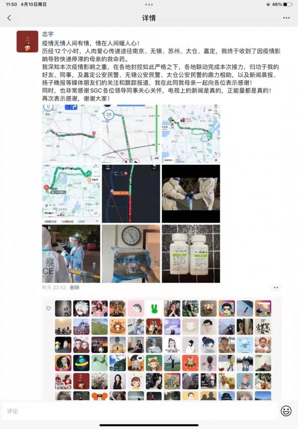 4月9日7時10分,陳先生發(fā)了一條朋友圈求助:“各位親朋好友,我現在急需南京的朋友人肉接力幫我媽緊急送個藥”“此藥巨貴且難買,如果大家誰有辦法完成接力,或部分路段的接力,請速與我聯(lián)系,非常感謝”。陳先生的求助引起大家的廣泛關注,朋友圈內紛紛響應、并出謀劃策。